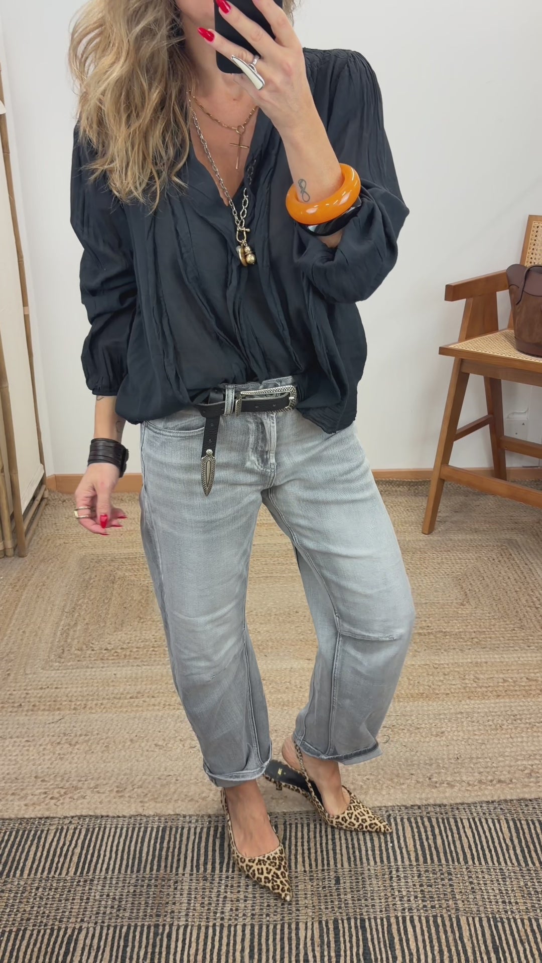 Cotton shirt. V-neckline. Front with ruffles. Long sleeves with elastic cuffs. Semi-transparent fabric.