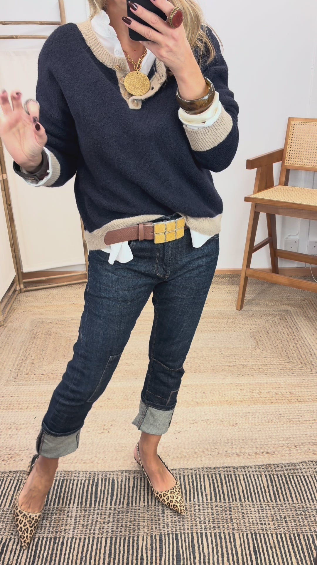 Wool knit sweater. Round neck with buttons. Long sleeves. Camel-colored contrast collar, cuffs, and hem. Elastic hem.
