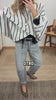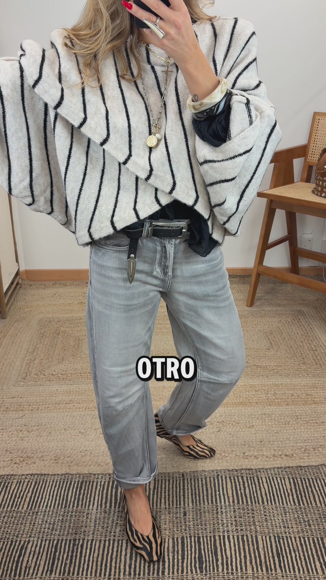 Maxi chunky knit sweater. Boat neck. Wide batwing sleeves. Contrasting black stripes. Cross-over detail at the front. Asymmetrical length. Oversized.