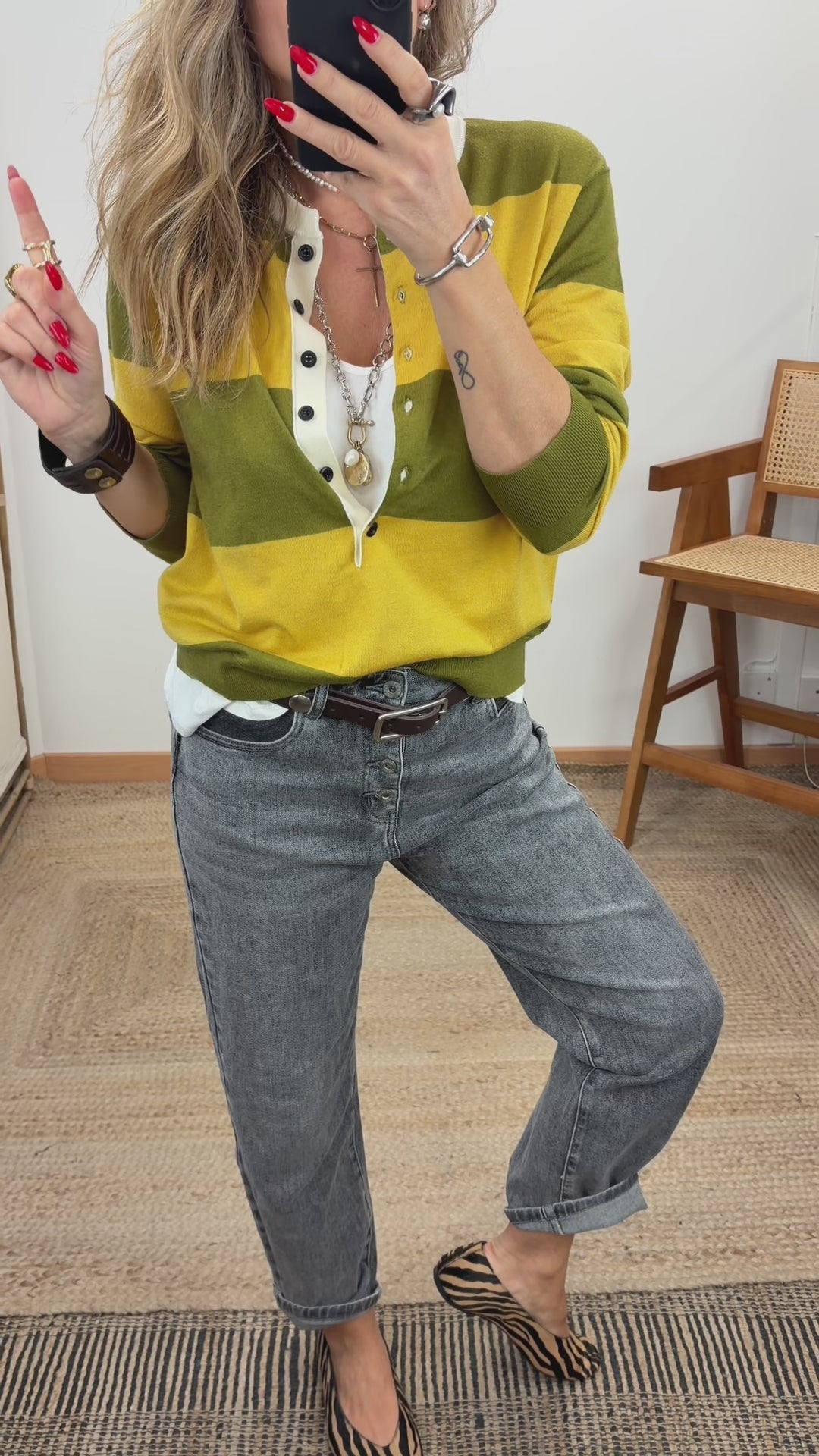 Fine knit mohair sweater. Round neck with buttons. Long sleeves with cuffs. Contrasting mustard/green stripe detail. Elasticated hem.