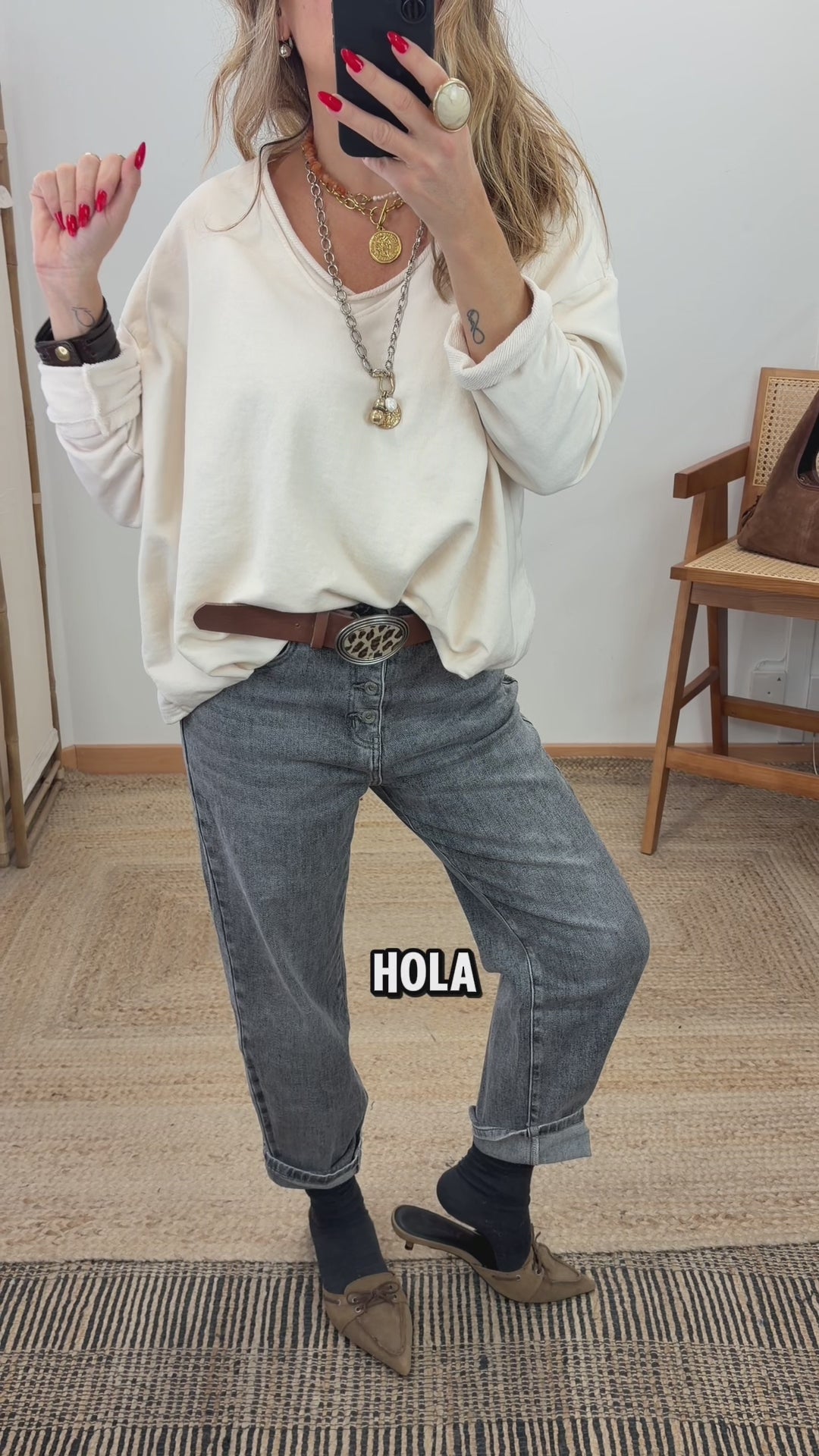 Maxi cotton sweatshirt. V-neck. Long sleeves. Pleated detail at the front hem. Asymmetrical length. Oversized.
