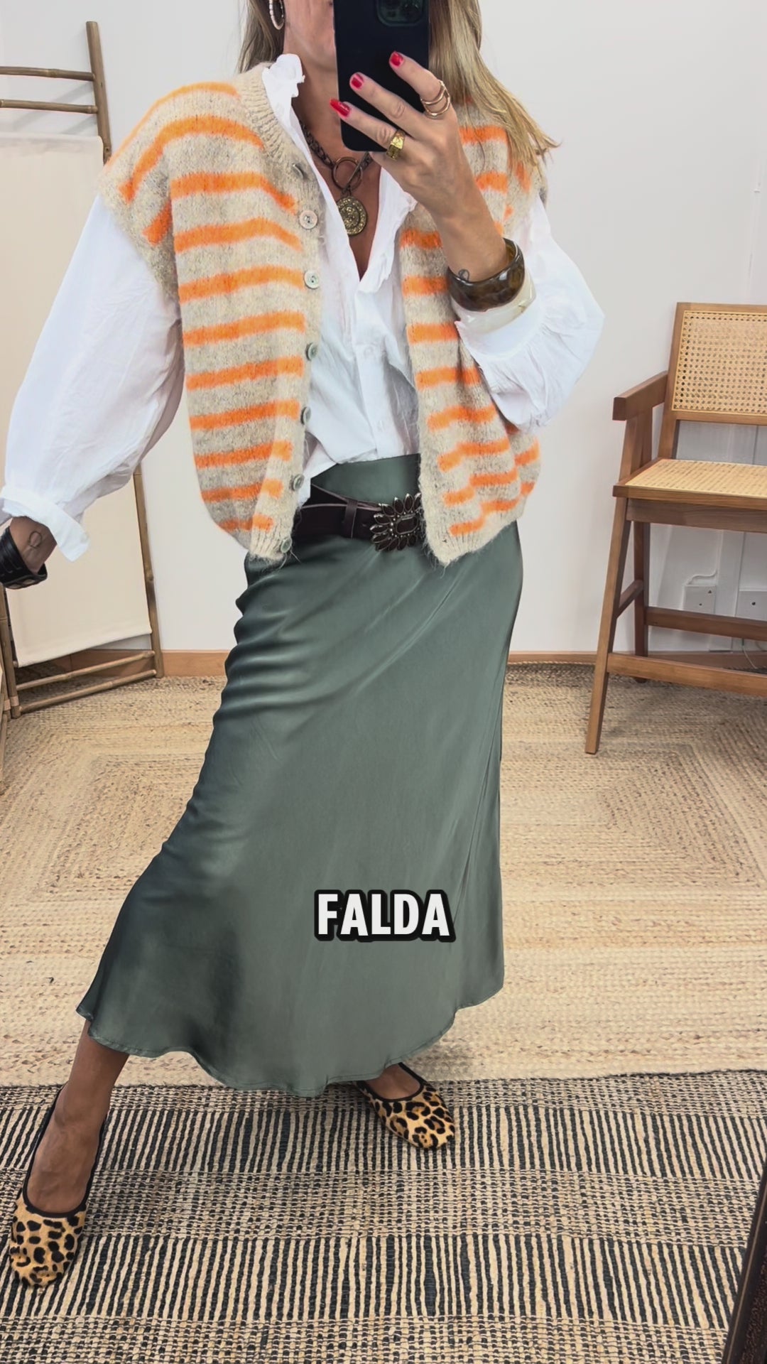 Long satin skirt. Elastic waistband. Flared cut. Unlined interior.