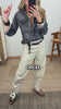 Faux leather barrel pants. Elastic waistband. Button and zipper closure. High rise. Side pockets.