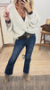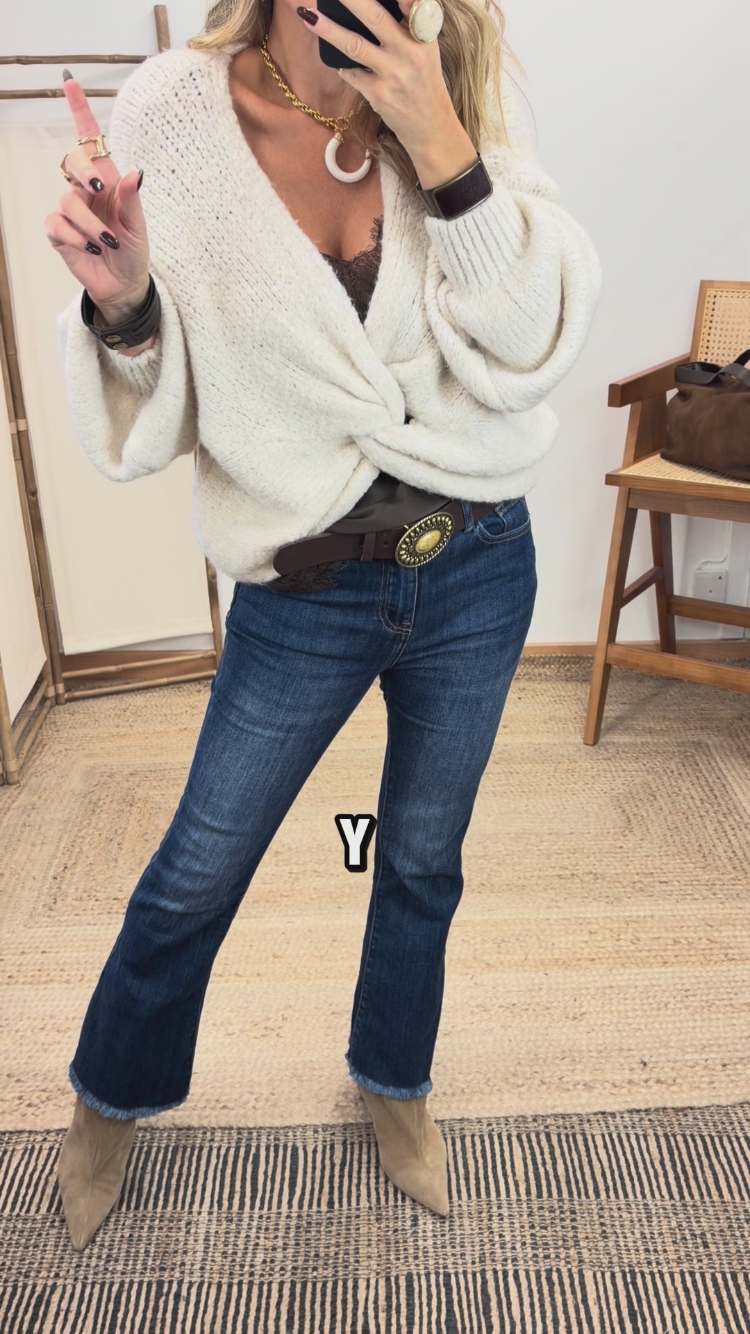 Stonewashed denim. Mid rise. Flared cut. Zipper closure. Frayed hem detail. Stretch fabric.