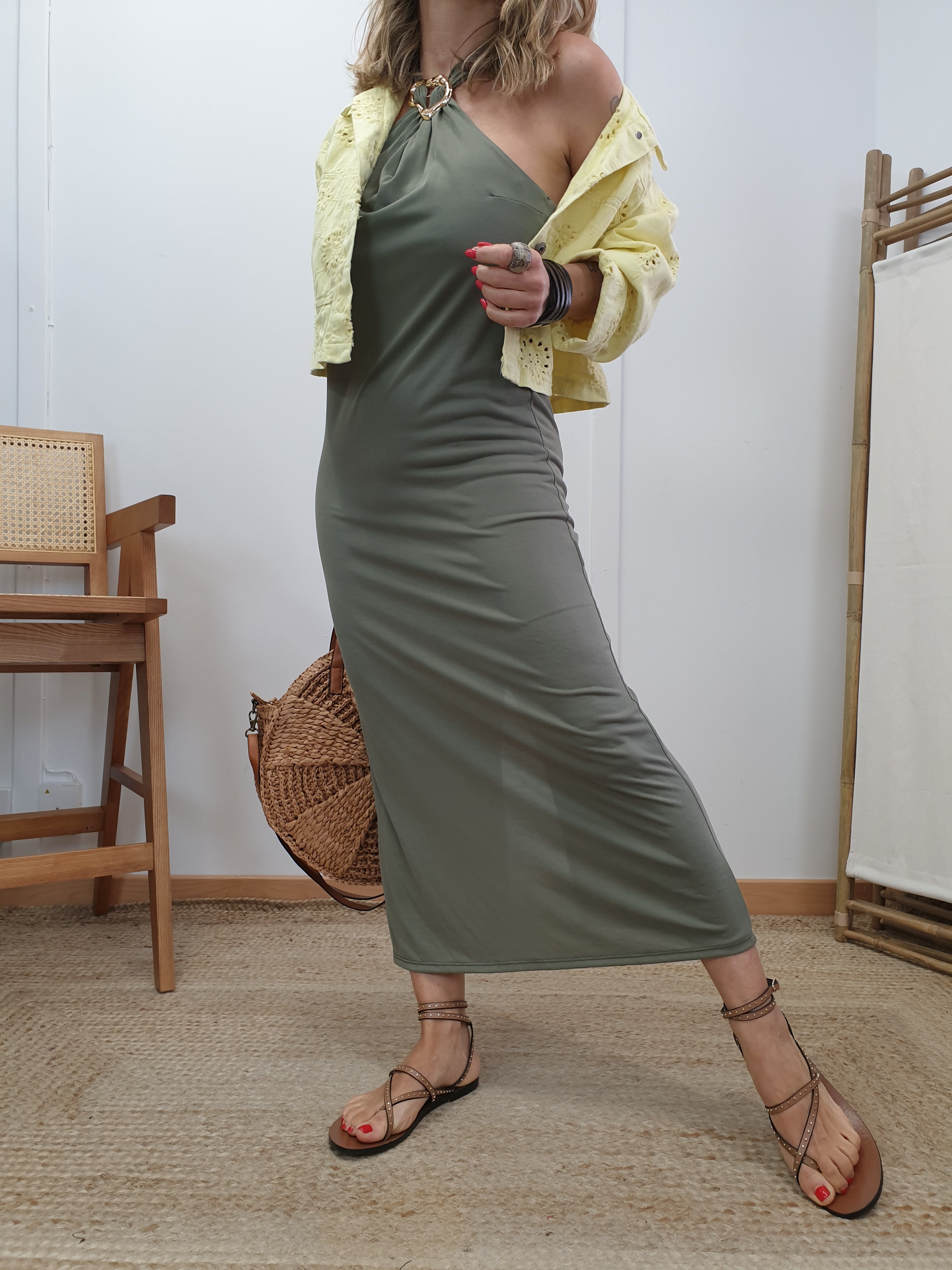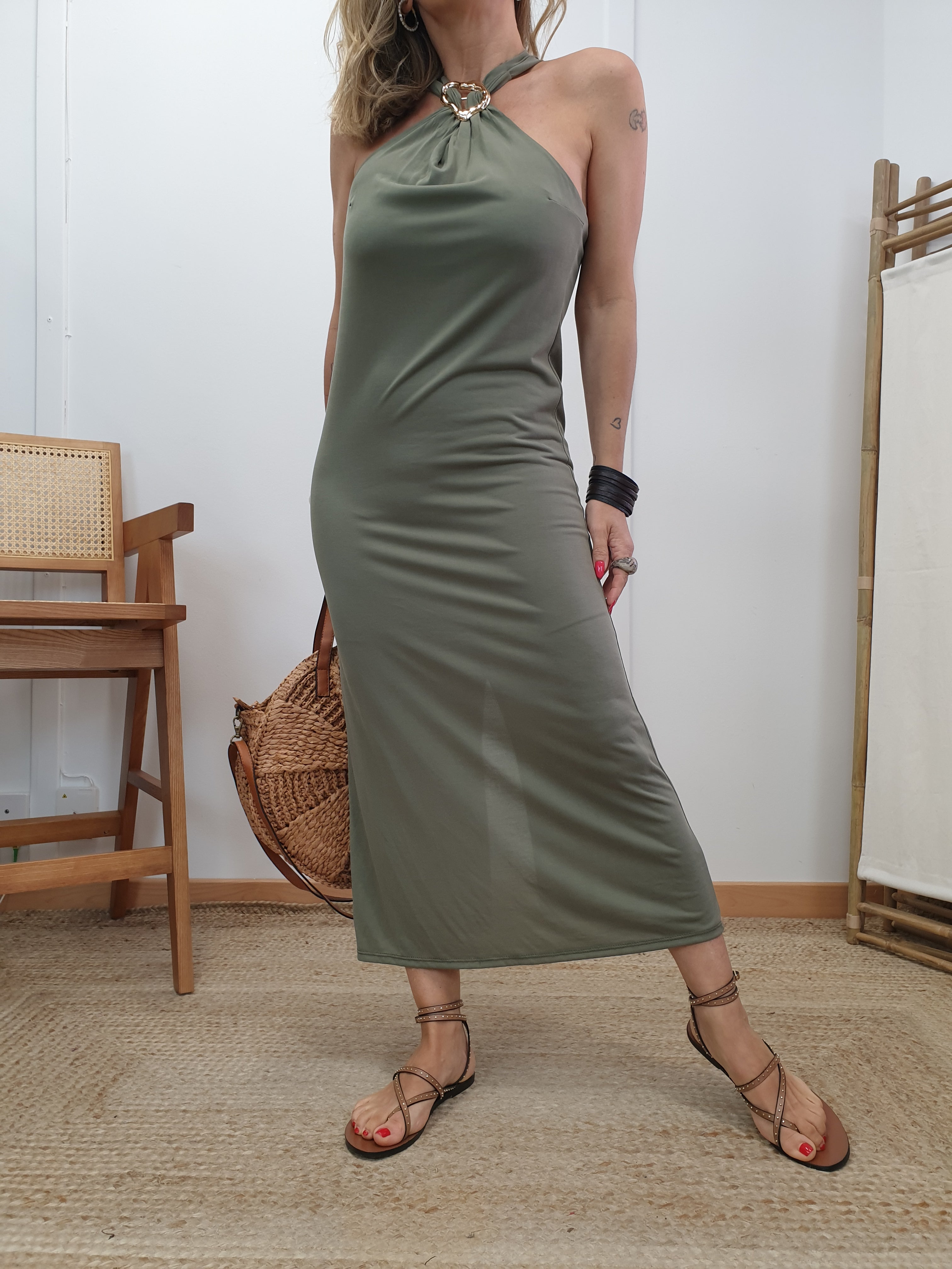 Long lyocell dress. Crossed neckline. Golden piece detail on the front and cut-out details. Opening at the lower back. Stretch fabric.