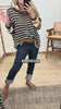 Round neck sweater. Long sleeves. Contrasting color collar, hem, and cuffs. Oversized.