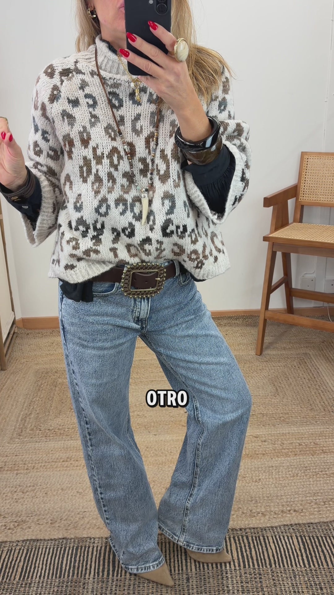 Thick knit sweater. Perkins collar. 3/4 sleeves. Contrasting animal print detail. Oversized.