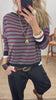 Boat neck sweater. Long sleeves. Contrasting color collar, hem, and cuffs. Maroon stripes. Oversized.