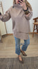 Plain knit jacket. Oversized Perkins collar. 3/4 sleeves. Double-breasted button closure. Asymmetrical hem. Unlined. Stretch fabric.