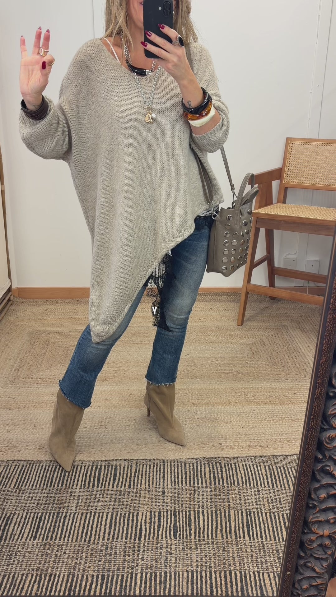 Maxi chunky knit sweater. V-neck. 3/4 sleeves. Asymmetrical long detail with slit. Oversized.