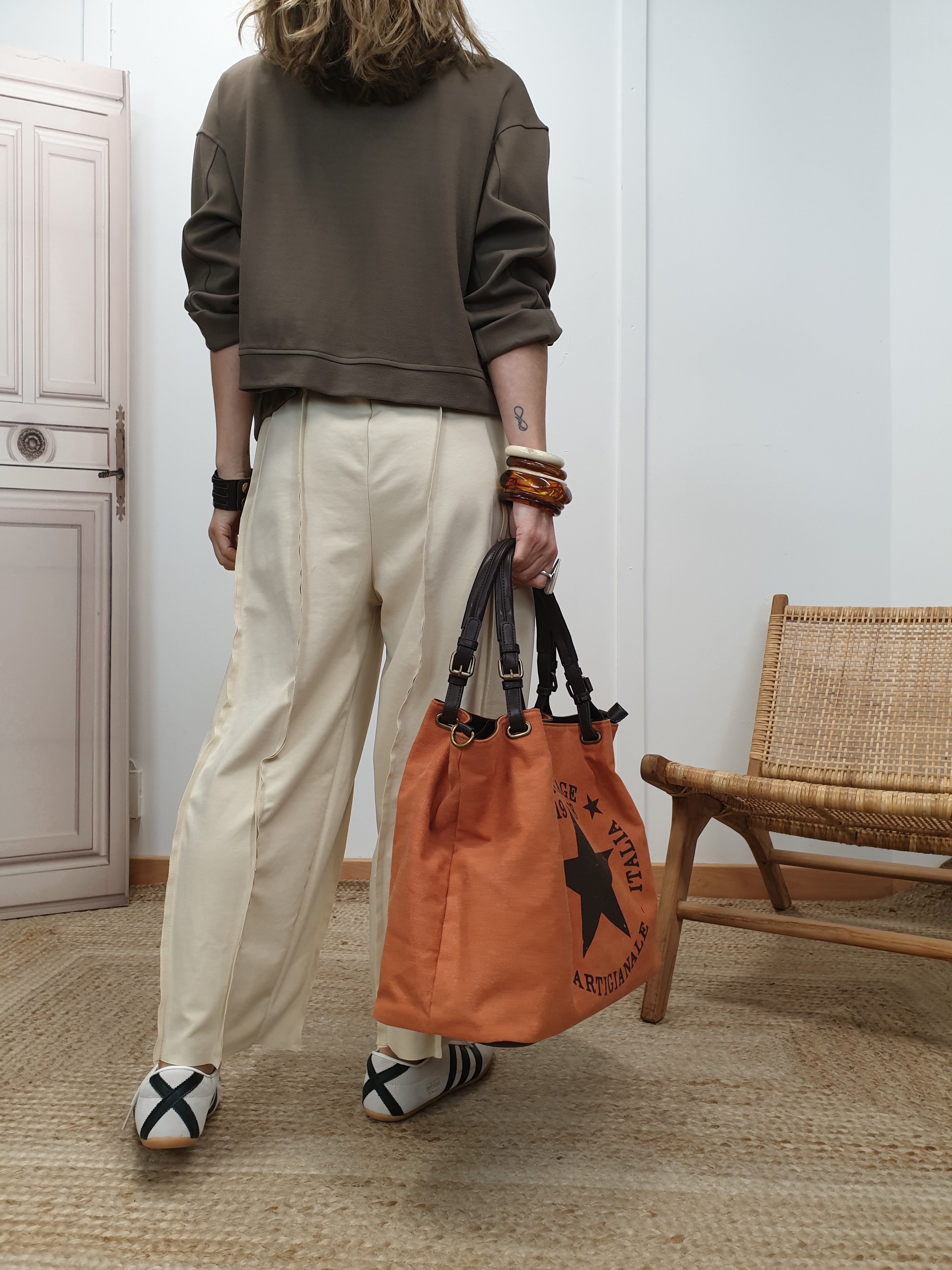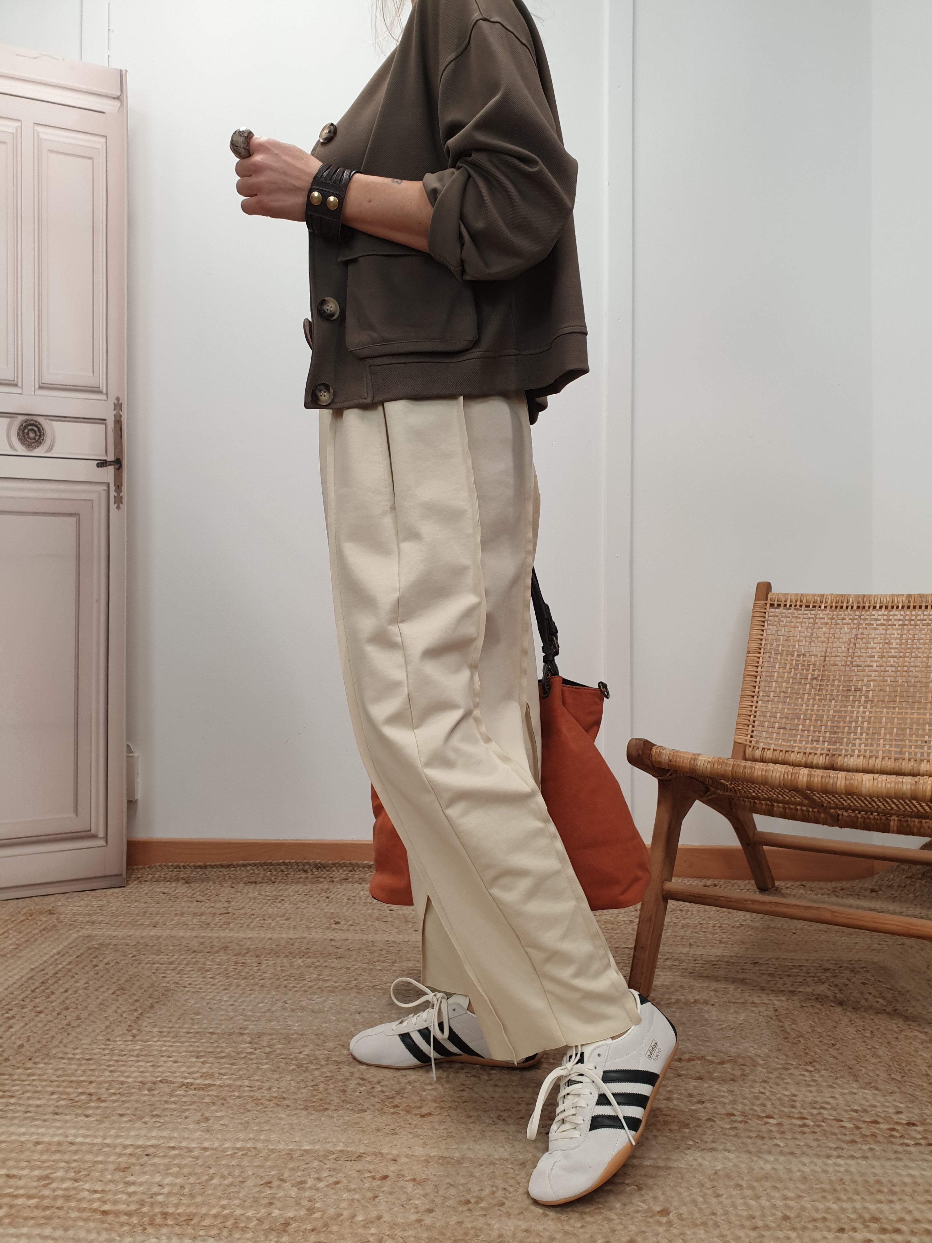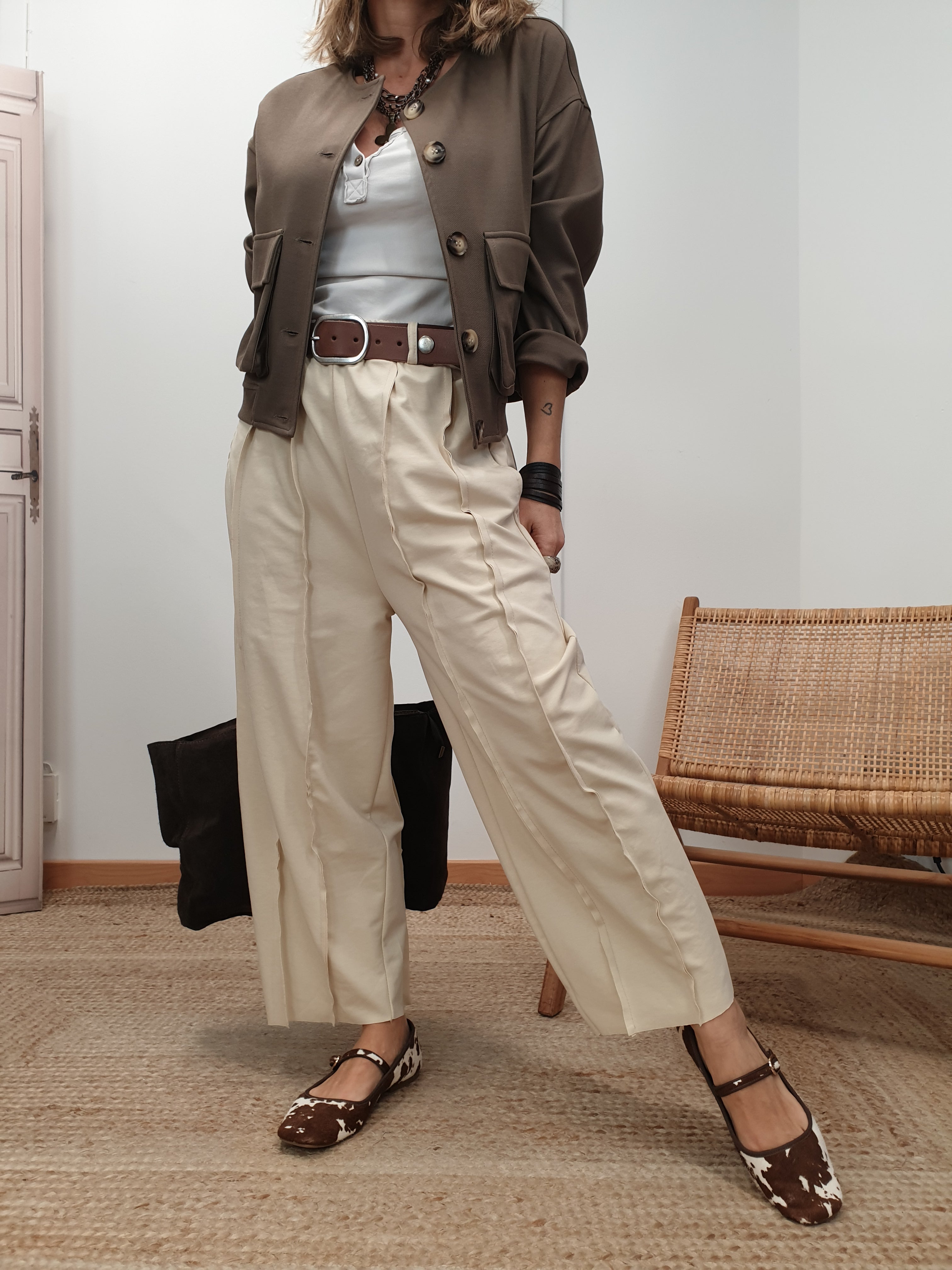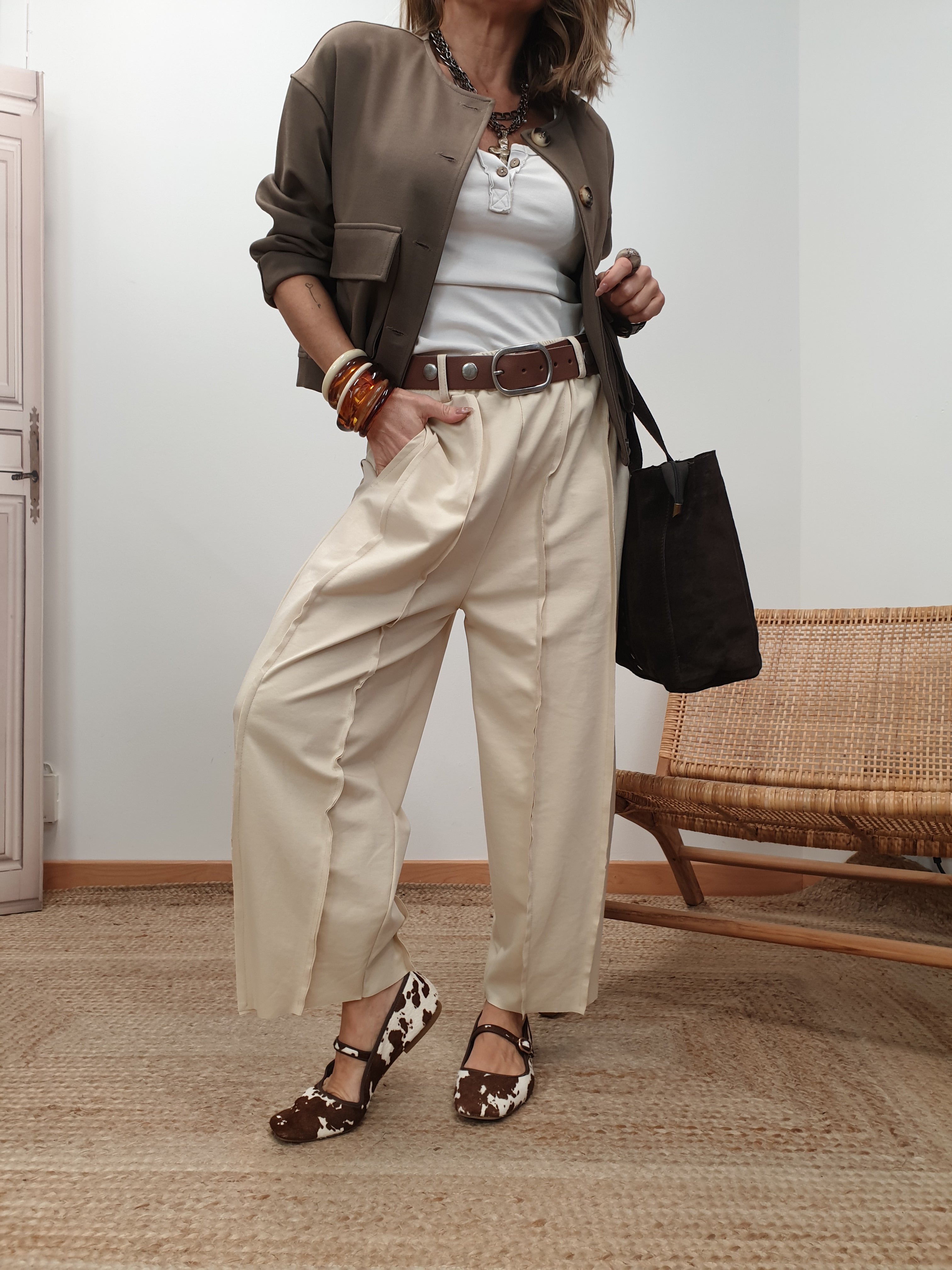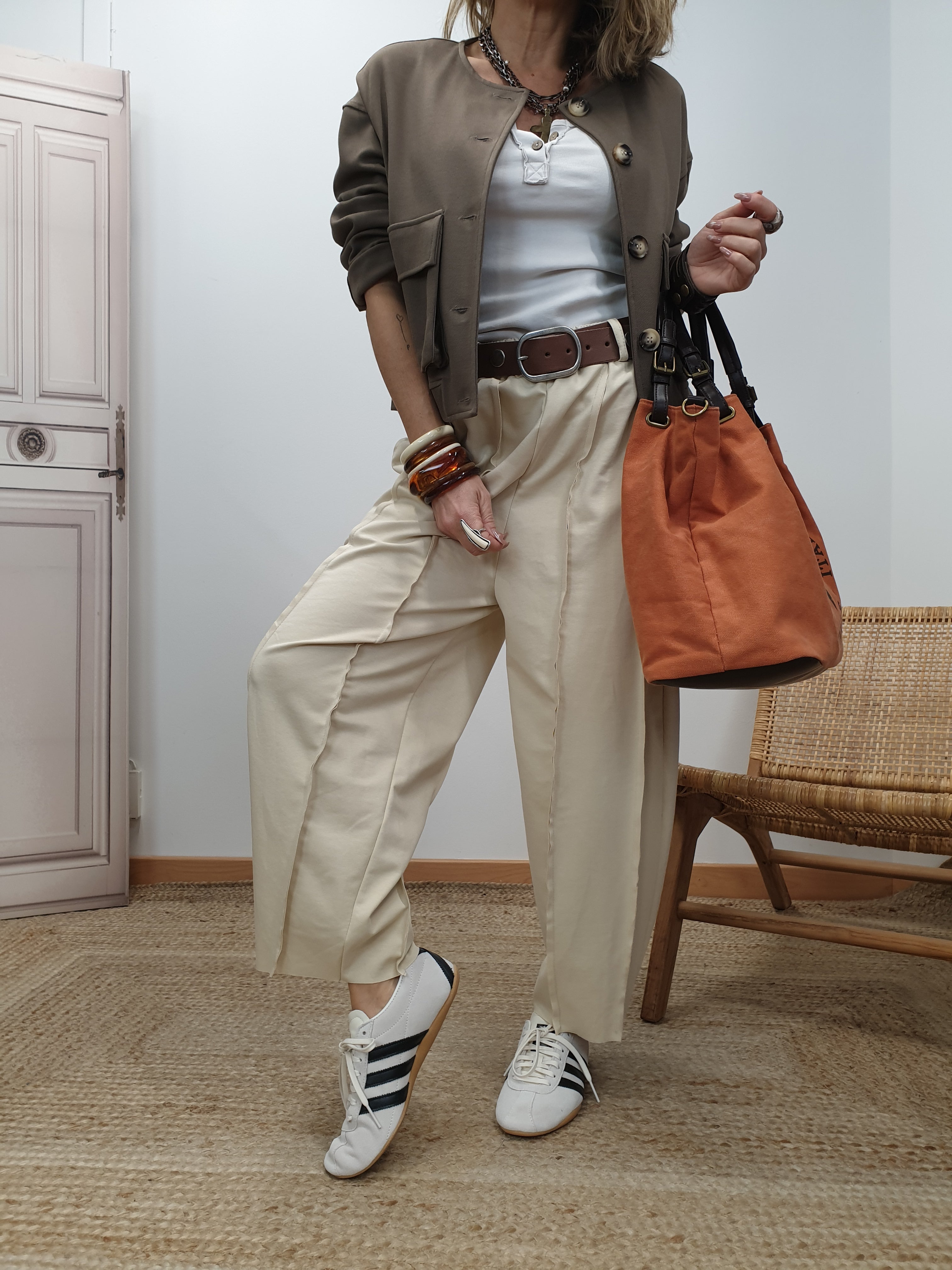 Viscose jogger pants. Elastic waistband with belt loops. Medium rise. Side pockets. Seams detail on leg. Baggy cut. Elastic fabric.