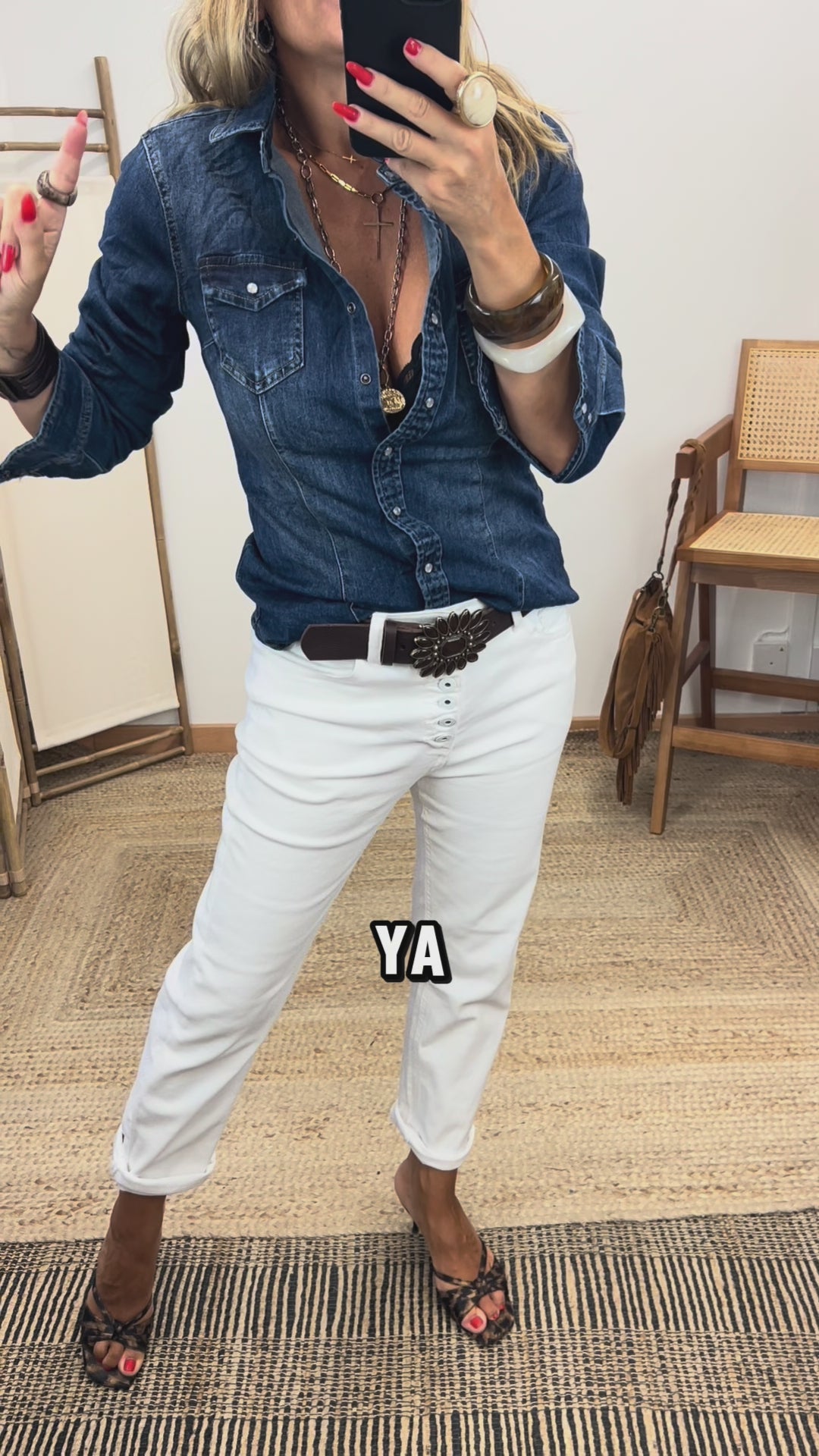 Chemise en jean de coton. Col chemise. Manches longues avec revers. Fermeture boutonnée. Devant avec poches. Tissu élastique.
