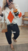 Pull en maille épaisse. Col chemise avec ouverture. Manches longues bouffantes avec poignets. Losanges orange contrastés. Ourlet élastiqué.