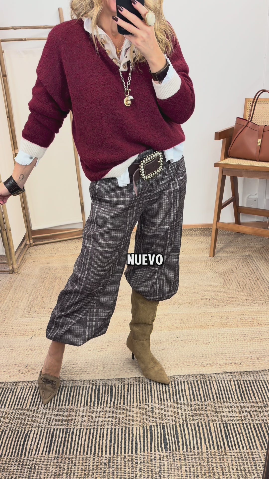 Pantalon bouffant en polyester. Taille élastique. Entrejambe moyen. Poches latérales. Carreaux contrastés. Oversize.