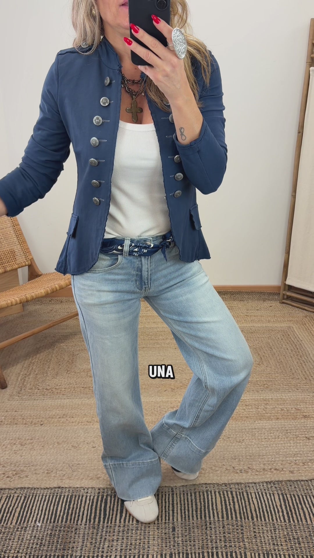 Blazer de algodón de estilo militar. Cuello redondo. Manga larga con charretaras en los hombros. Cierre con corchete. Detalle hilera de botones en frontal. Tapeta falsos bolsillos. Corte entallado. Tejido elástico. Largo asimétrico.