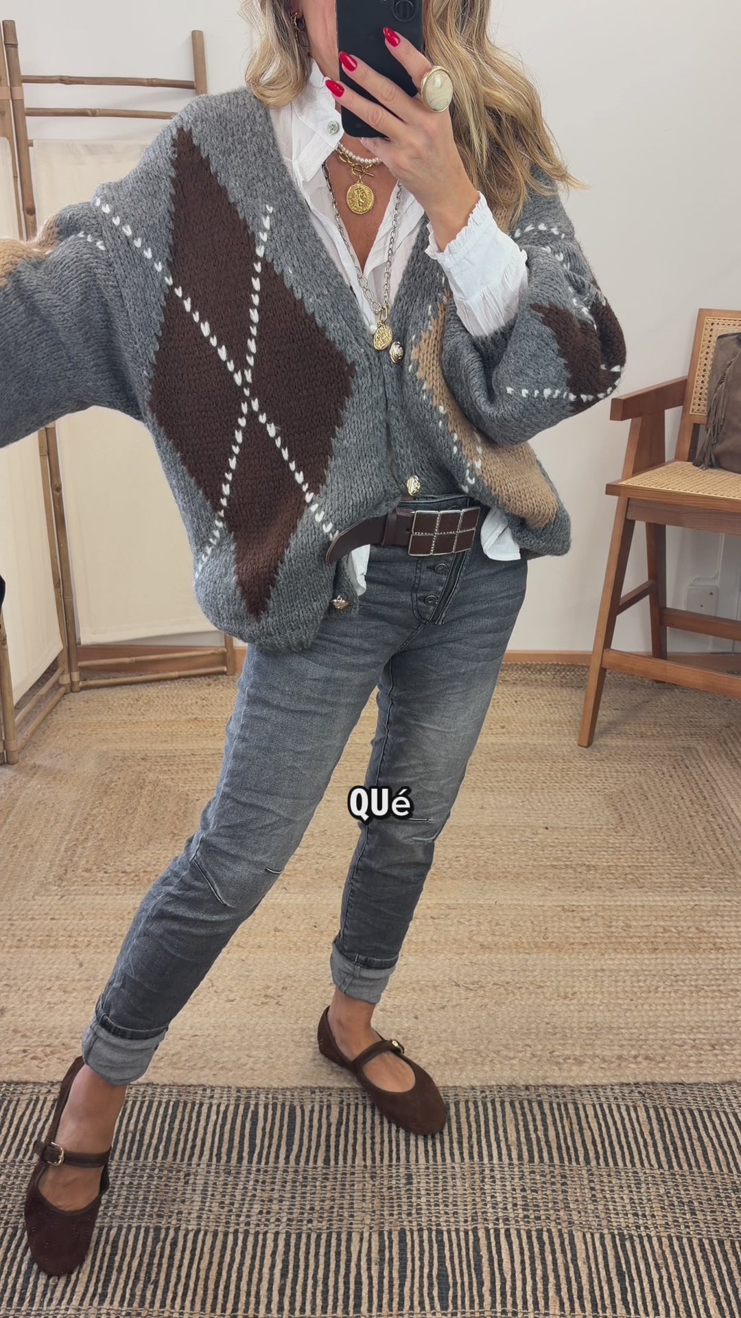 Cárdigan de punto grueso. Manga larga con puño. Cuello pico. Cierre con botones. Rombos en contraste. Bajo con elástico. Oversize.