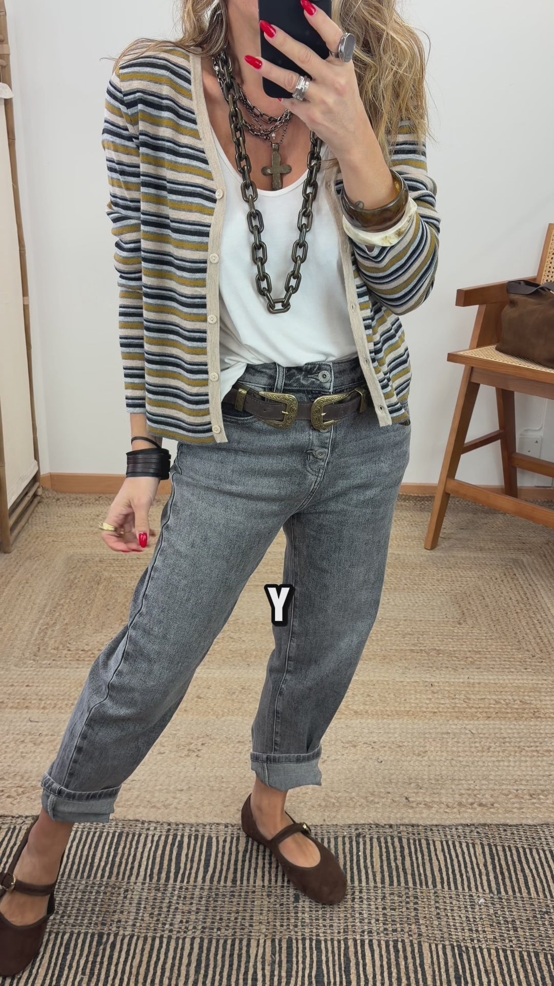 Cardigan con lana mohair y de punto fino. Escote en V con botones. Manga larga. Detalle franjas en contraste de color mostaza/gris/negro.