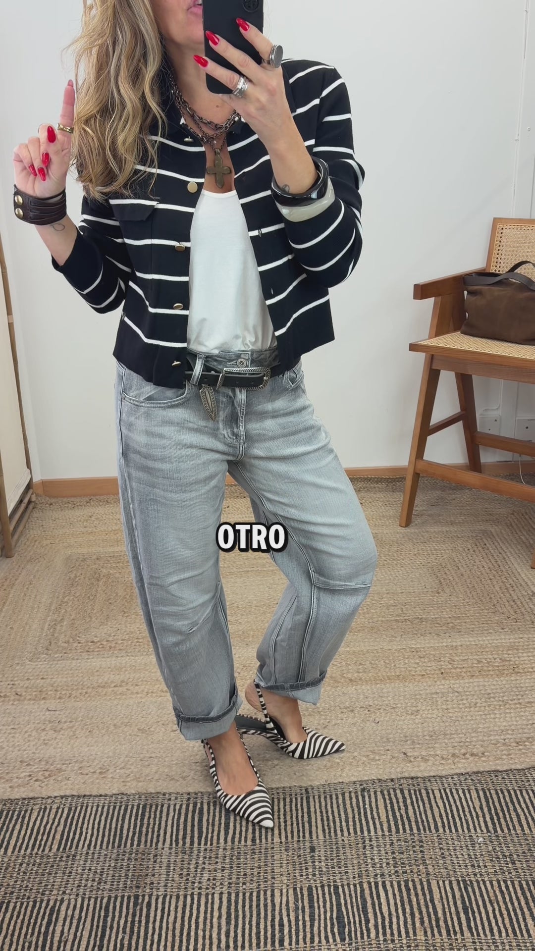 Cárdigan crop top de punto fino. Cuello camisero. Manga larga. Frontal con botones. Detalle franjas blancas en contraste. Detalle tapeta falsos bolsillos.