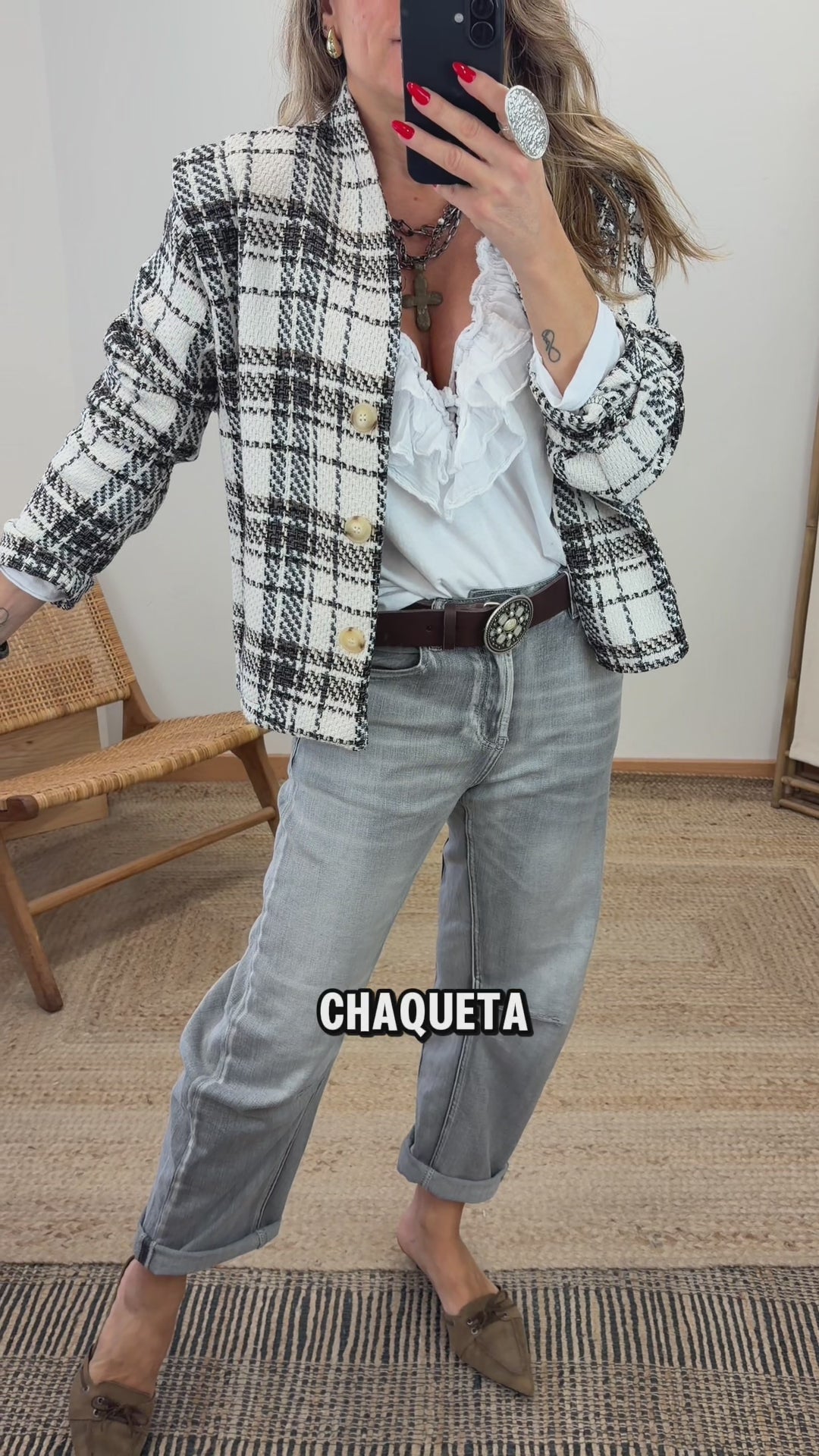 Chaqueta de tweed. Cuello redondo. Manga larga. Detalle estructura en hombro. Cierre con botones. Bolsillos laterales. Cuadros en contraste de color gris y marrón. Interior sin forro.
