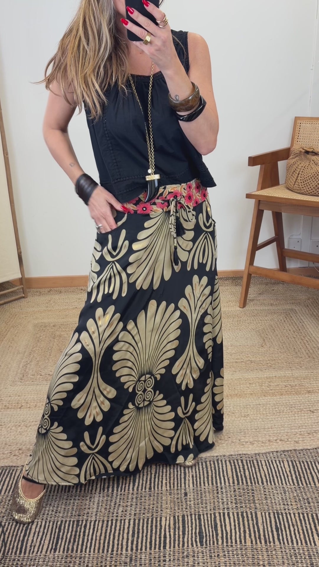 Falda larga de seda. Cintura elástica con cordón. Cintura con detalles bordados. Bolsillos en cintura. Estampado en contraste. Interior sin forro.