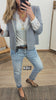 Tejano lavado a la piedra. Tiro alto. Corte slim. Cierre con cremallera. Tejido desgastado. Tejido muy elástico.