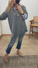 Maxi jersey de punto grueso. Cuello pico. Manga larga. Detalle largo asimétrico con blonda. Oversize.