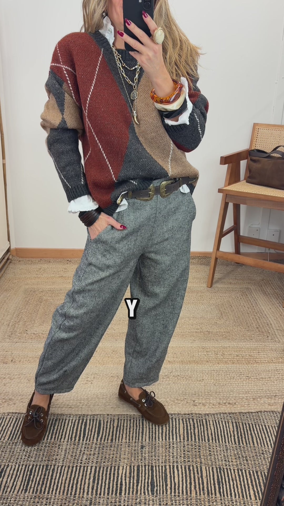 Jersey de punto grueso. Cuello redondo. Manga larga con puño. Bajo con elástico. Rombos en contraste en color caldera y camel. Oversize.
