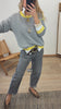 Jersey de punto fino. Cuello redondo. Manga larga con puño. Ribetes y mangas en contraste de color amarillo. Bajo con elástico.