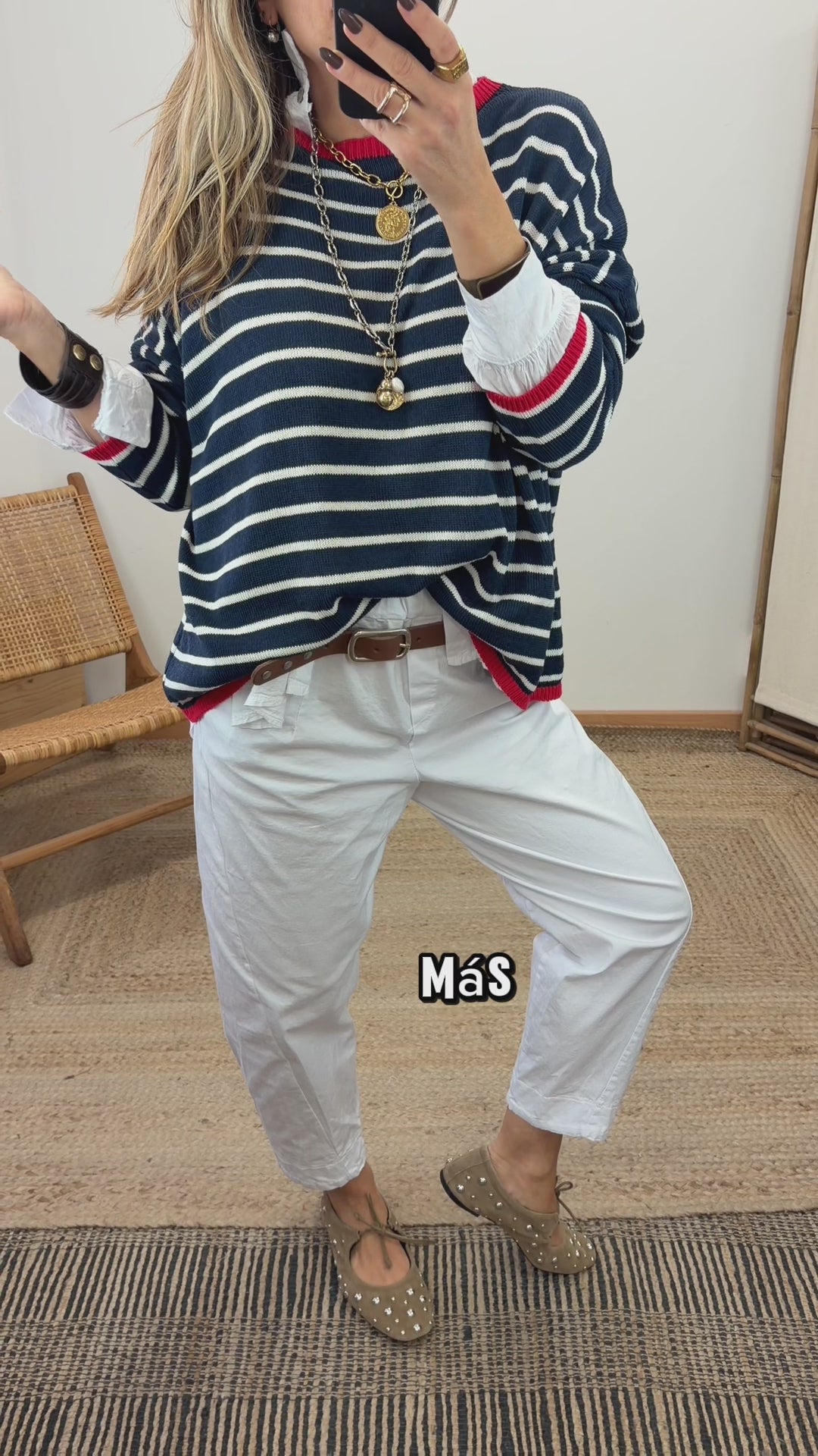 Jersey de cuello redondo. Manga larga. Cuello, bajo y puño en contraste de color. Oversize.