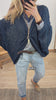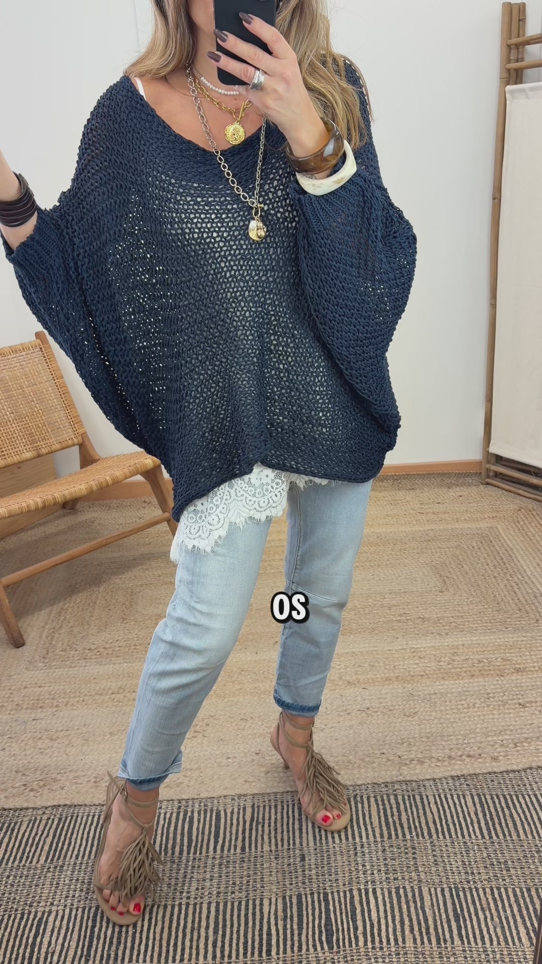 Jersey de punto calado. Cuello en V. Manga murciélago. Detalle fruncido central con pieza extraíble. Oversize.