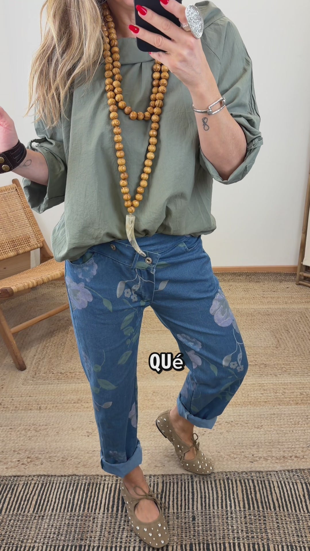 Pantalón de algodón. Cintura elástica. Tiro bajo. Bolsillos laterales. Detalle botones en diagonal. Tejido muy elástico. Estampado floral en contraste