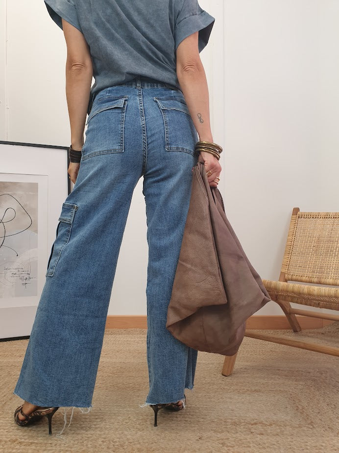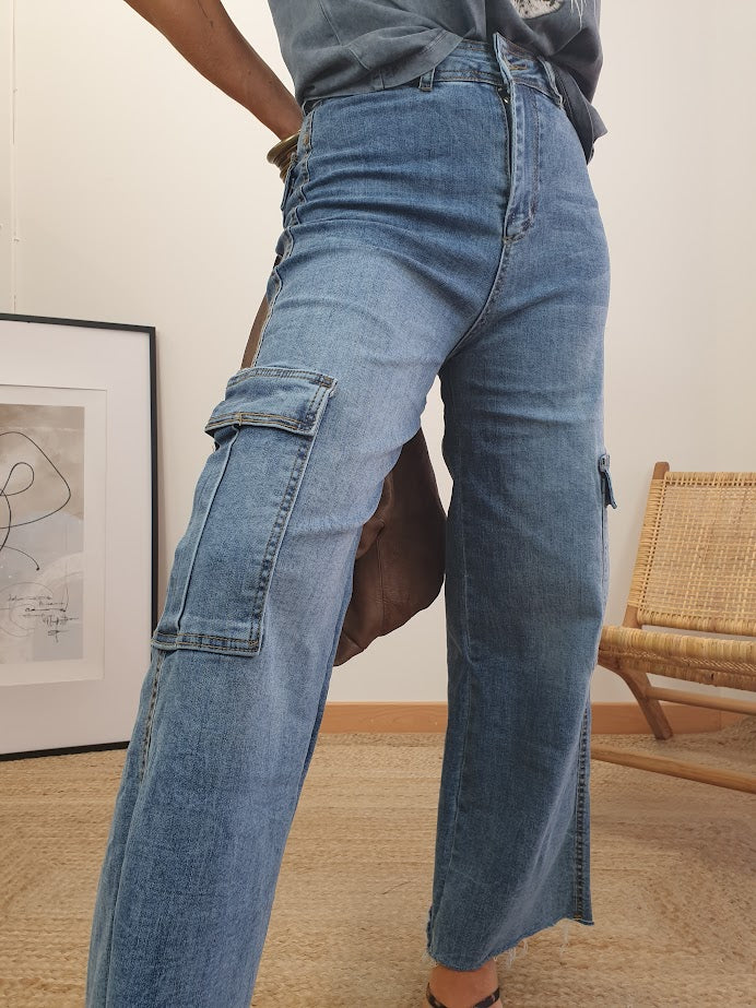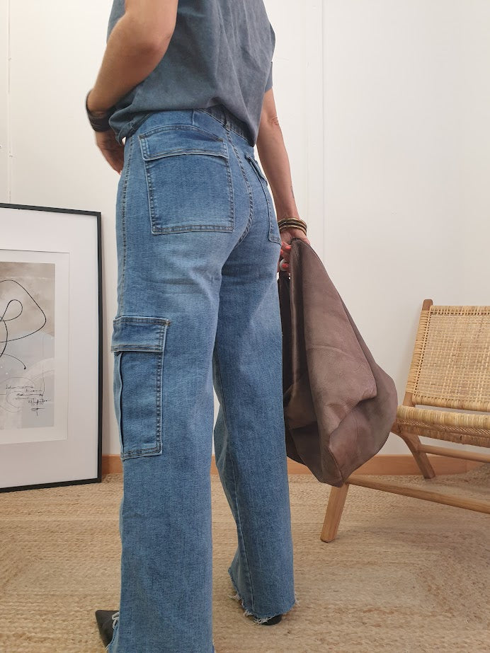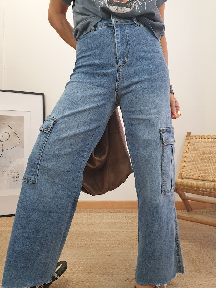 Tejano lavado a la piedra. Tiro medio. Corte campana. Cierre con cremallera. Detalle bajo desflecado. Tejido elástico.