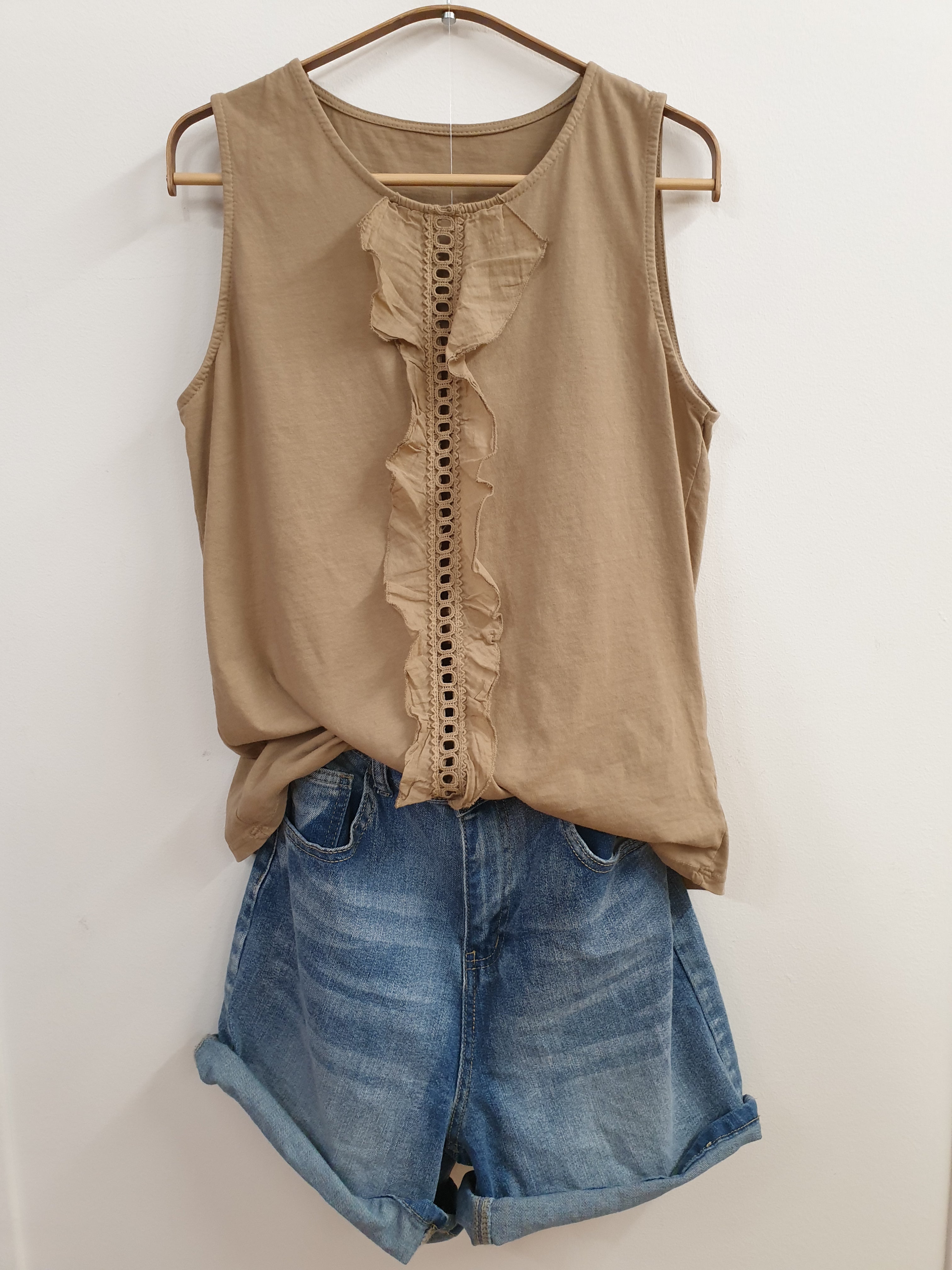 Camiseta de algodão. Gola redonda. Alça larga. Detalhe do volante na frente. Tecido elástico. Corte flare.