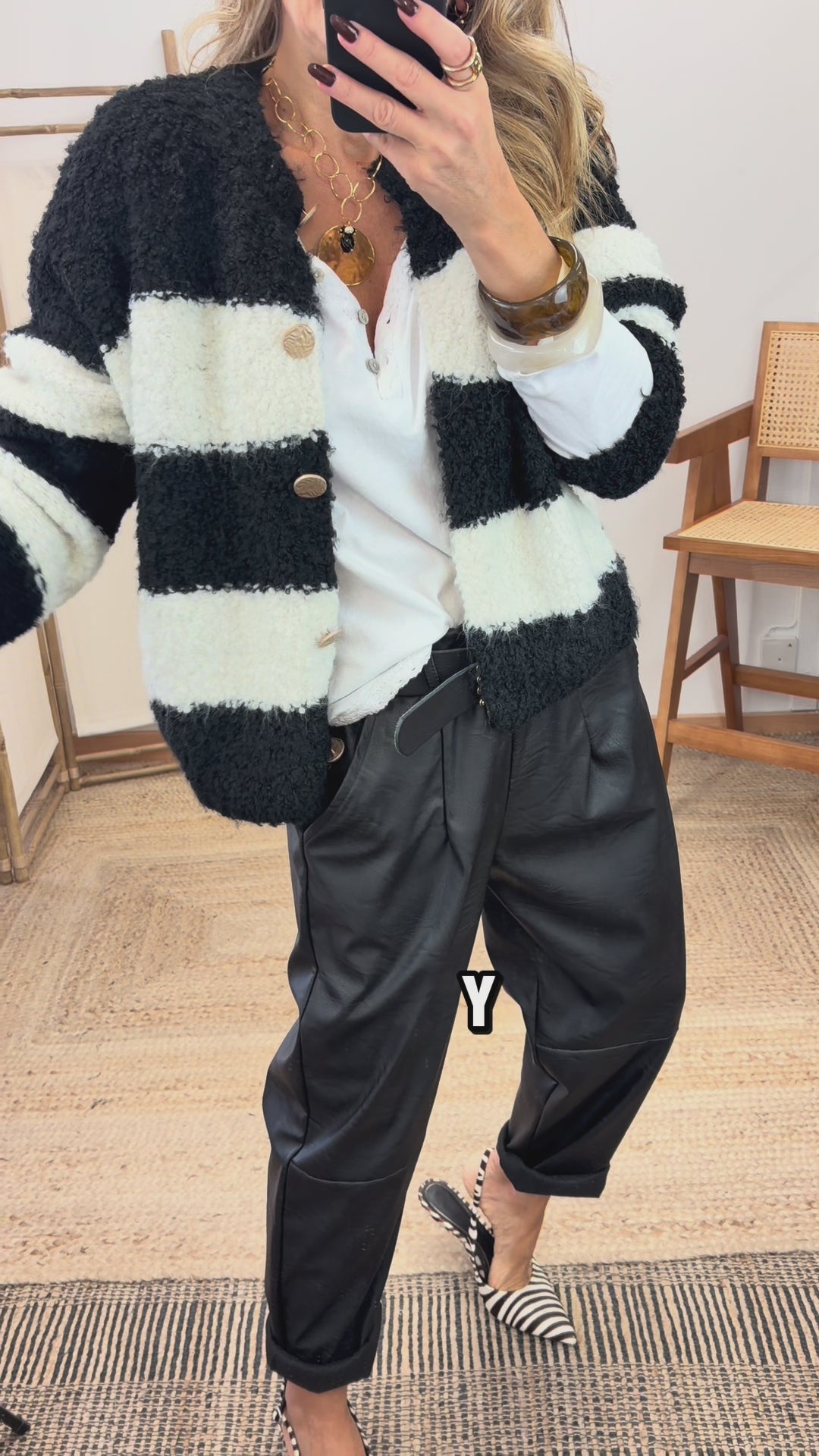 Casaco de malha com ponto enrolado. Gola redonda. Manga comprida. Frente com botões. Faixas contrastantes. Oversize.