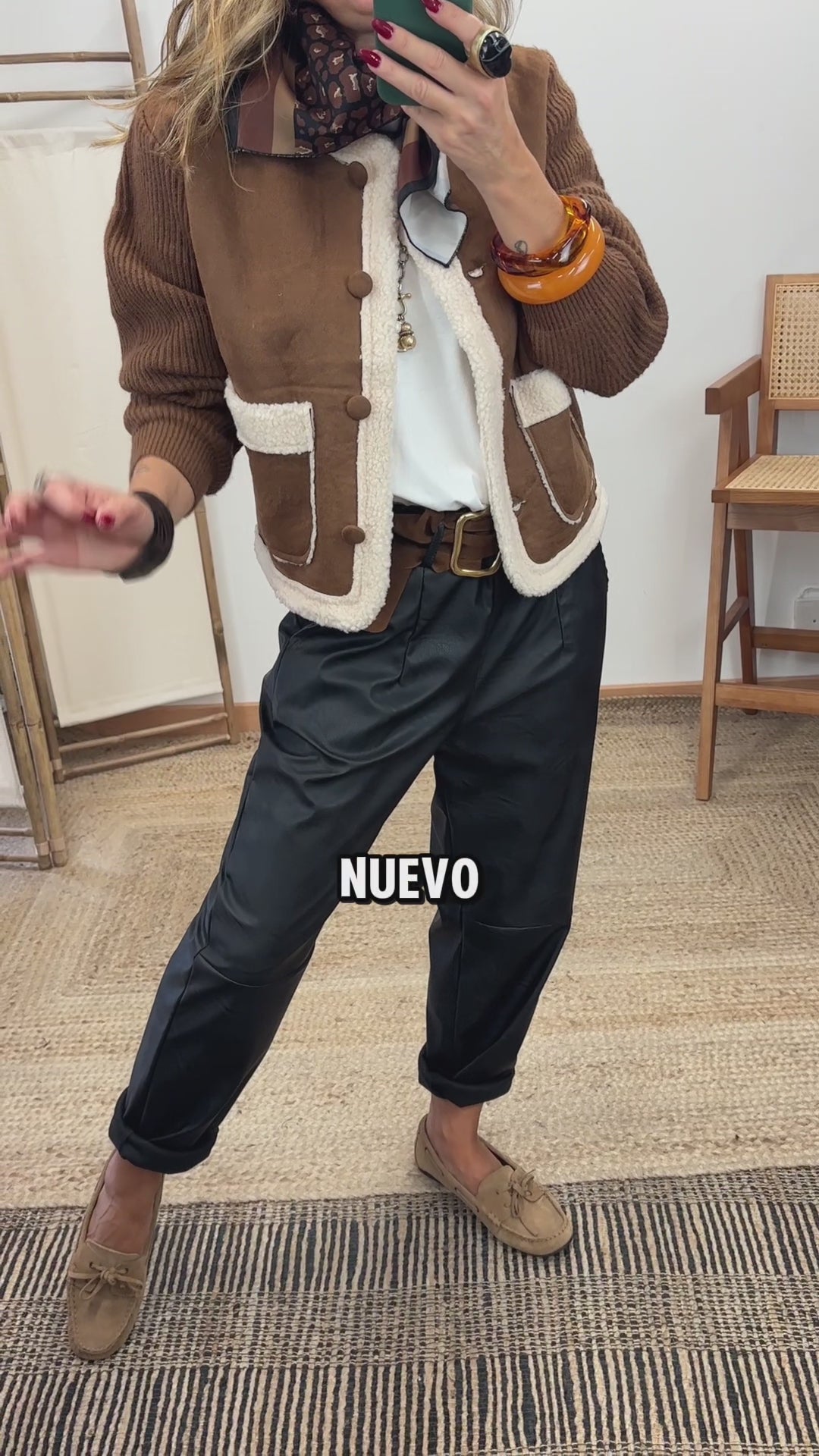 Casaco dupla face. Gola redonda. Mangas compridas caneladas. Fecho com botões. Bolsos laterais. Detalhe com rebordo de pêlo curto encaracolado. Tecido de malha nas costas.